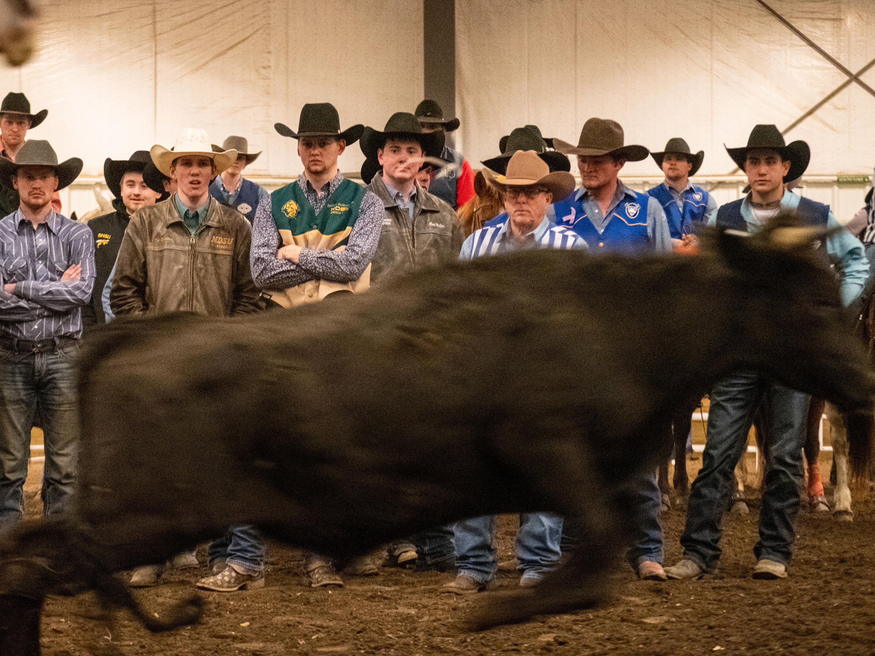 The co-chairs of the “Super CY Bros.” Yell Like Hell group watch the group’s silent warm-up during the Yell Like Hell First Cuts on Monday, Oct. 30, 2023, at Iowa State University in Ames, Iowa.