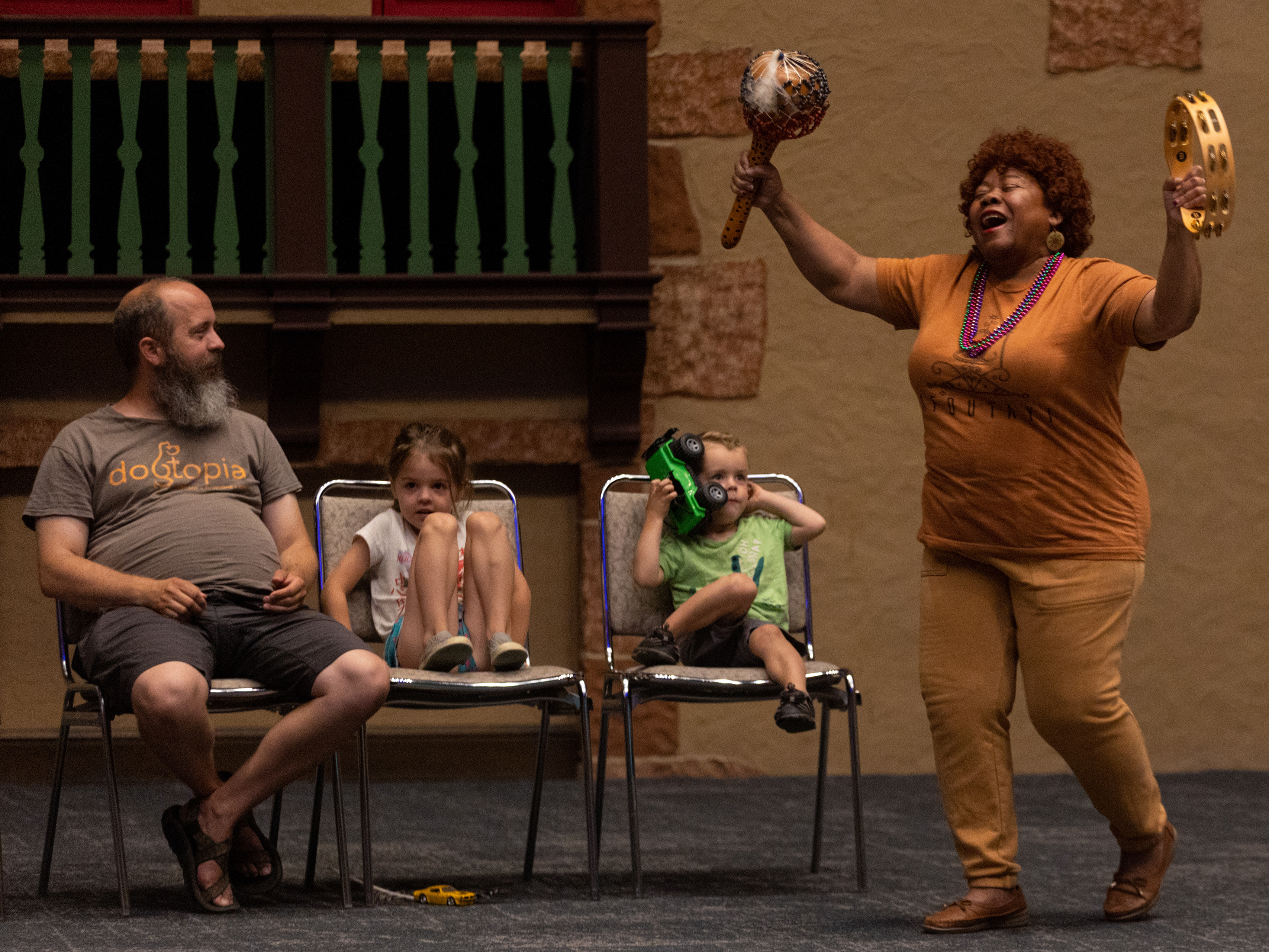 Members of the “Adventures of Sharkboy, Lavagirl, and CY” Yell Like Hell group watch the “Dr. Suess: CY-Ville” group silently warm up during the Yell Like Hell First Cuts on Monday, Oct. 30, 2023, at Iowa State University in Ames, Iowa.